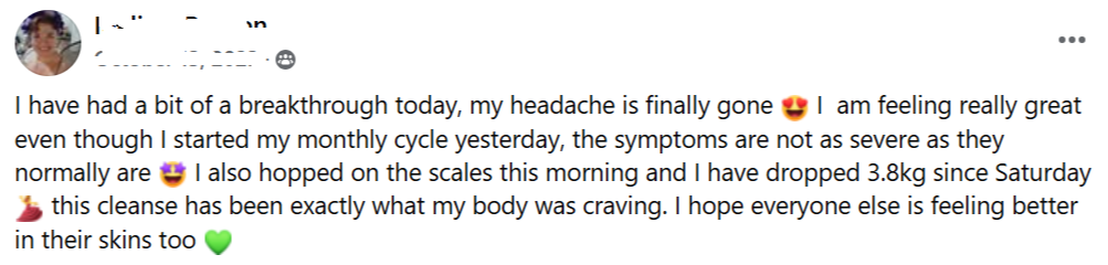 I have had a bit of a breakthrough today, my headache is finally gone 😍 I am feeling really great even though I started my monthly cycle yesterday, the symptoms are not as severe as they normally are 🤩 I also hopped on the scales this morning and I have dropped 3.8kg since Saturday 💃 this cleanse has been exactly what my body was craving. I hope everyone else is feeling better in their skins too 💚