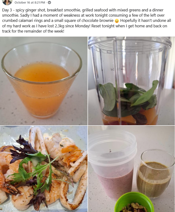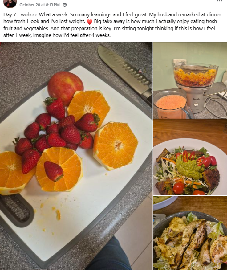 The last 3-4 days I am full of energy. I started exercising much more. I went to the farmers market today again and cooked a lot of vegetables and prepared healthy snacks for the next couple of days. I decided to continue green smoothies and vegetables dishes for lunch as well as healthy snacks also lost 2 kilos and I usually struggle to lose weight. Do it definitely work very well for me. Thank you very much Melissa Wilkes